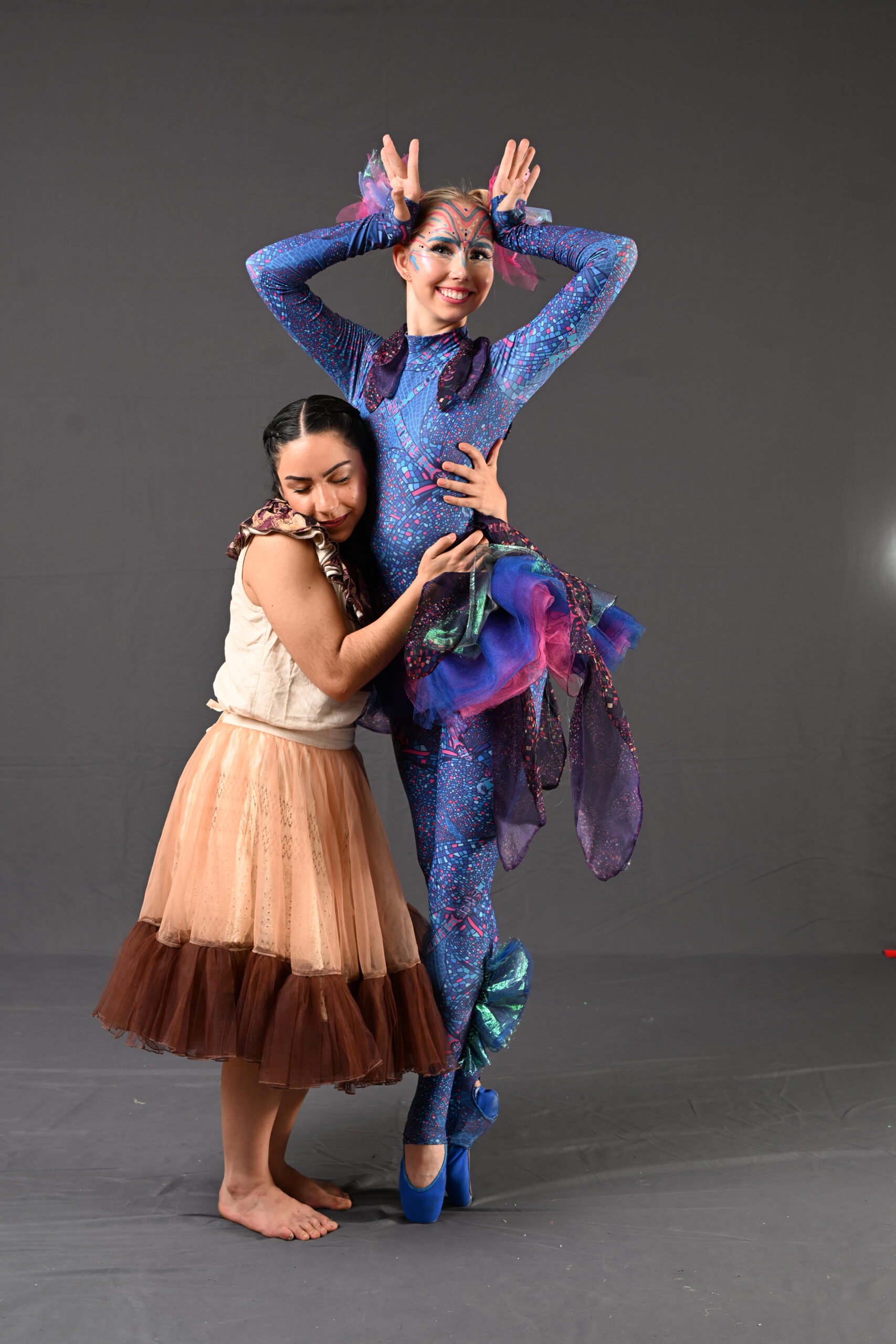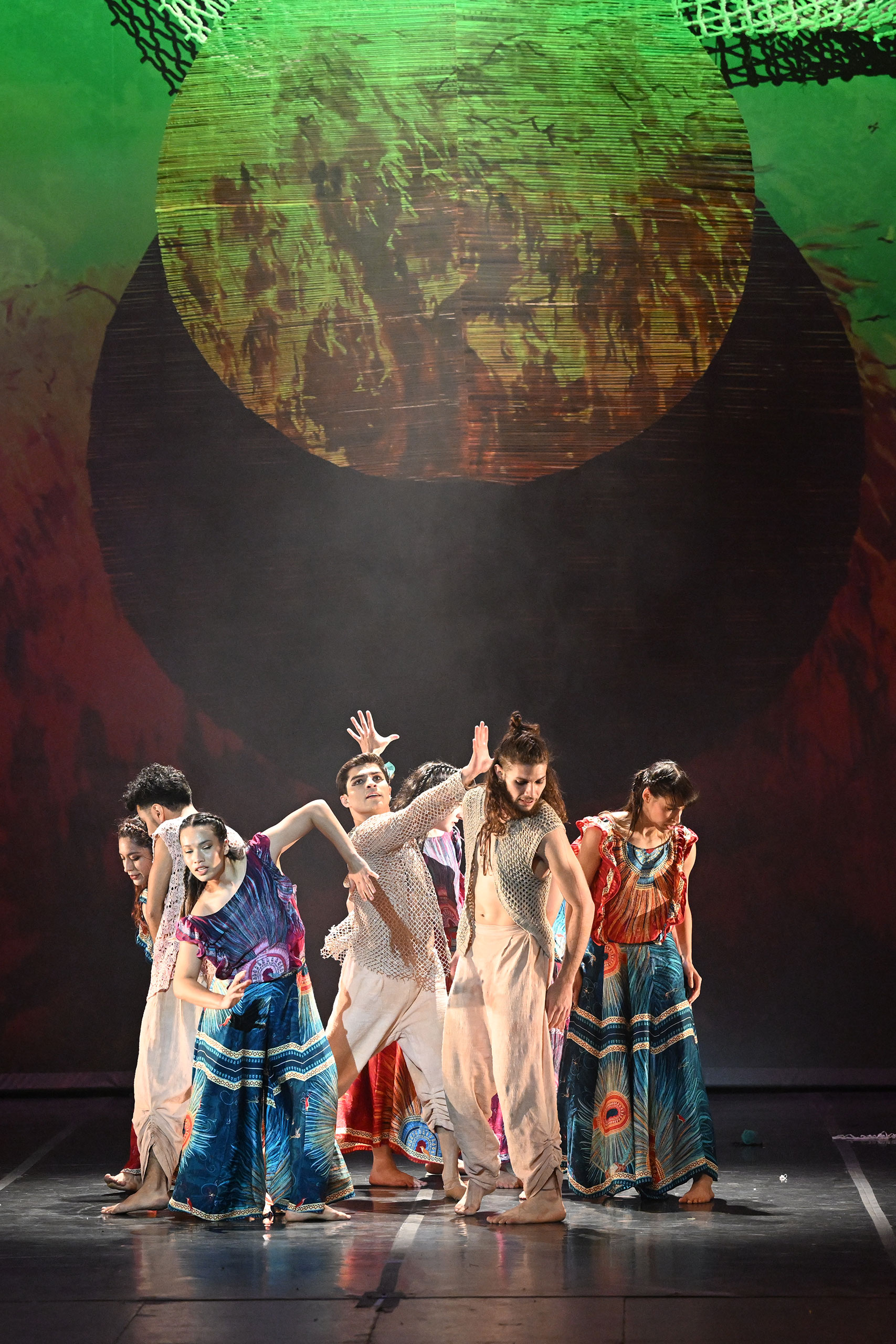 Nuestro lenguaje escénico se basa en historias de transformación, identidad y emociones profundas, donde lo mítico, lo cultural y lo contemporáneo conviven de manera elegante y simbólica. Utilizamos elementos como animales-guía, portales, agua, luz y criaturas híbridas para representar viajes internos, renacimientos y procesos de evolución.